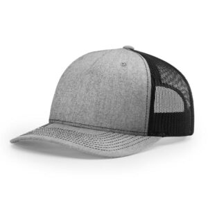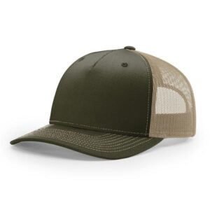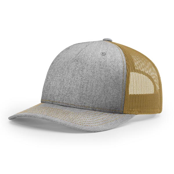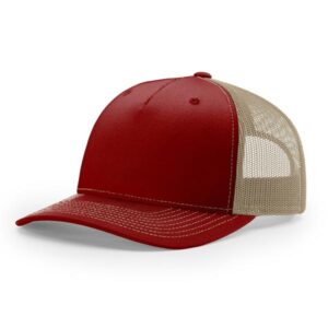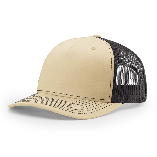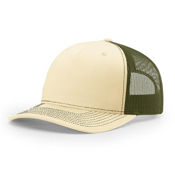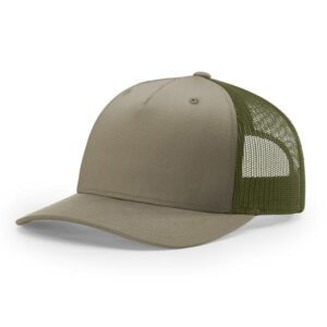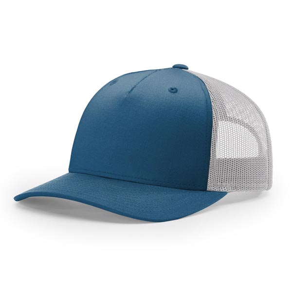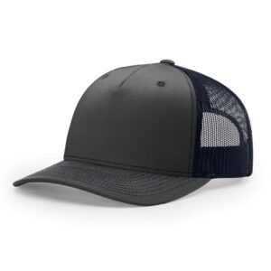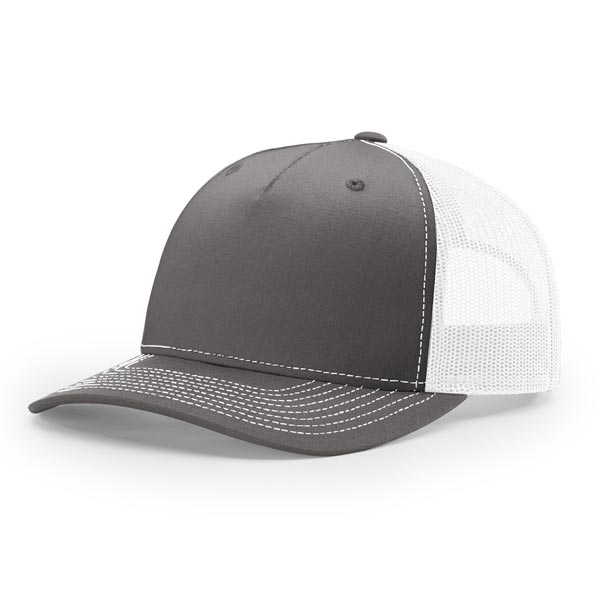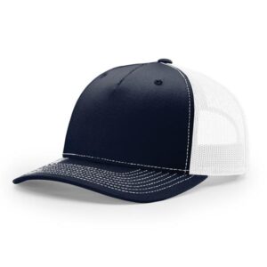 The 112FP Five Panel Trucker features a mid-pro shape, adjustable snapback fit, precurved visor, made with a twill/poly mesh fabric.